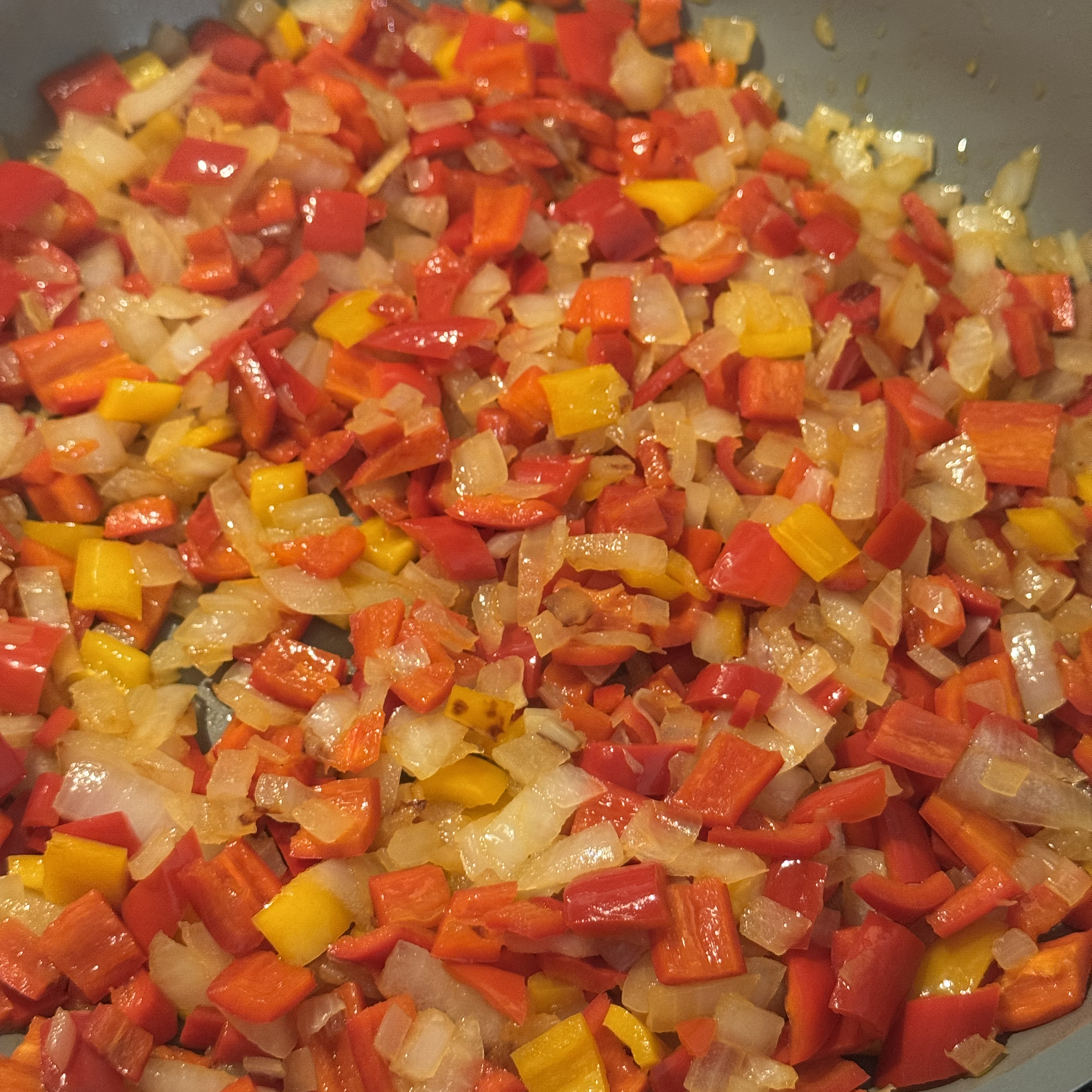 Step 1: Sauté diced onion and bell peppers in olive oil on medium heat.
