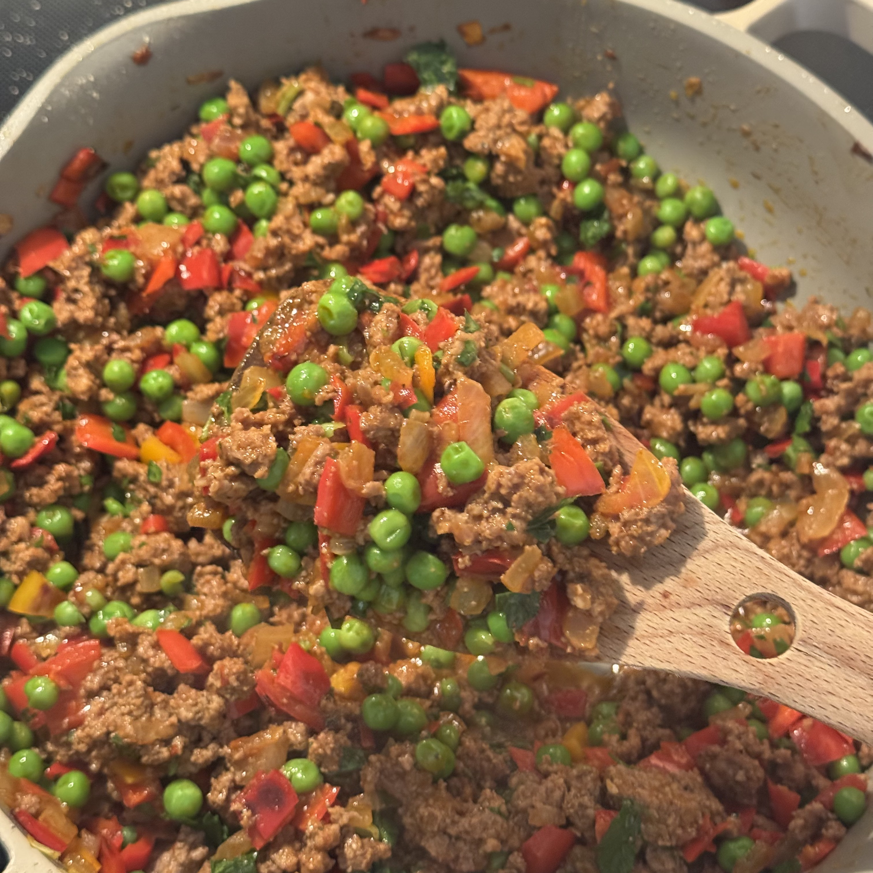 1. Sauté diced onion and bell pepper in olive oil on medium heat, then add ground beef and cook all the