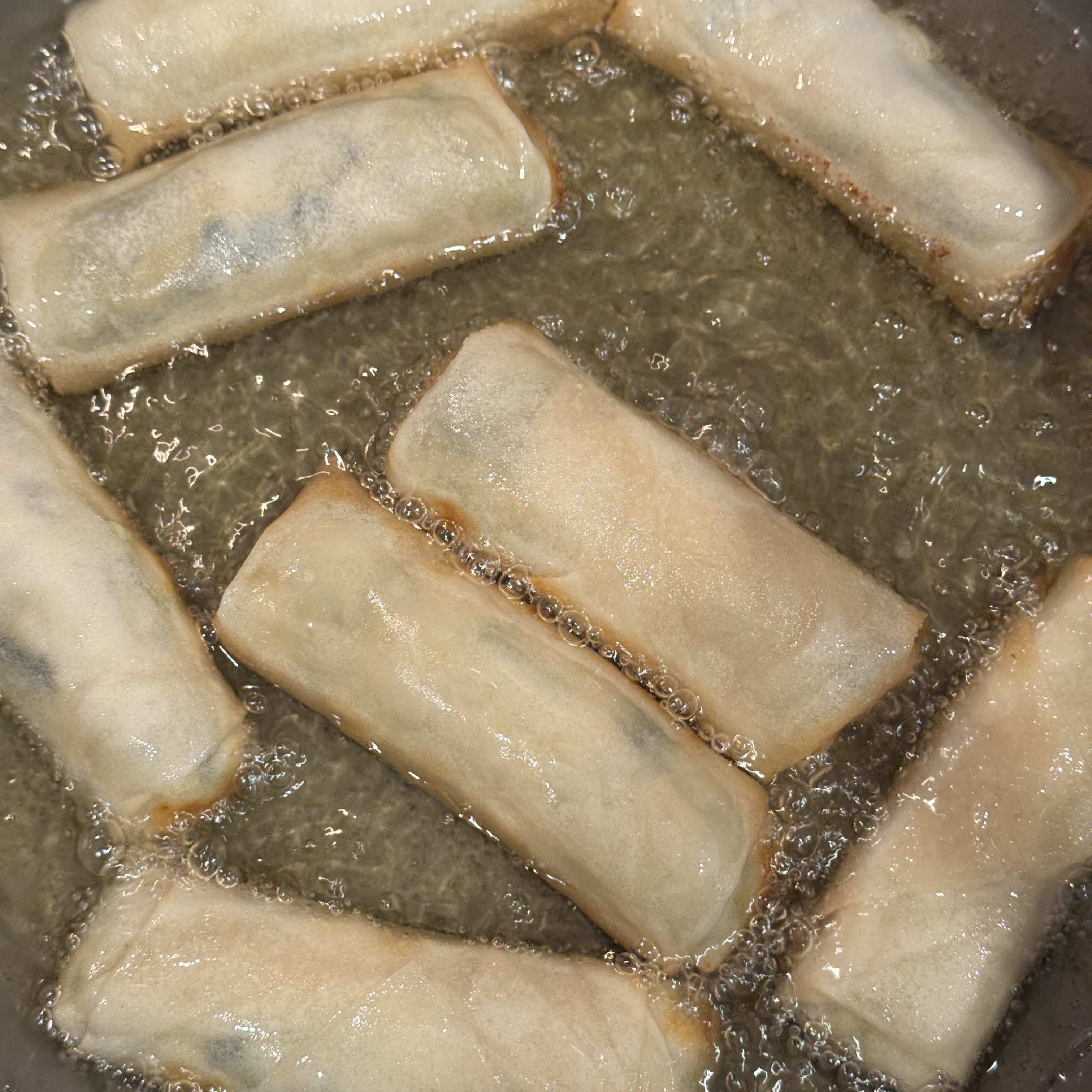 • Fry: Heat oil to 350°F. Fry egg rolls 2–3 minutes per side until golden and crispy.
