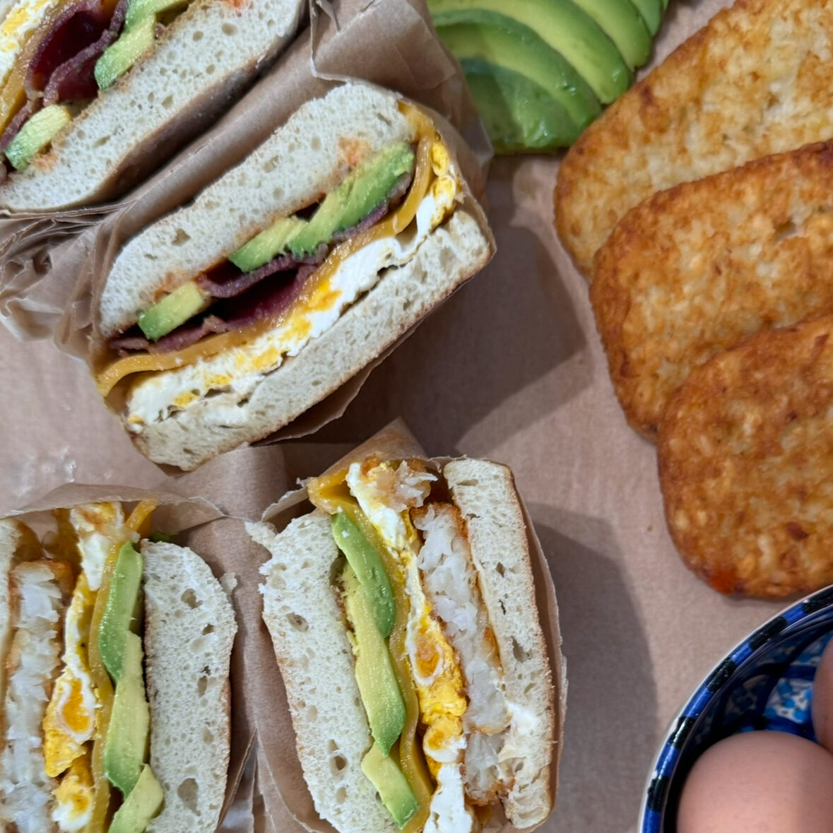 - Step 4: Assemble the sandwich: spread mayo on the muffins, then layer the egg, cheese, bacon, avocado, and hot sauce.