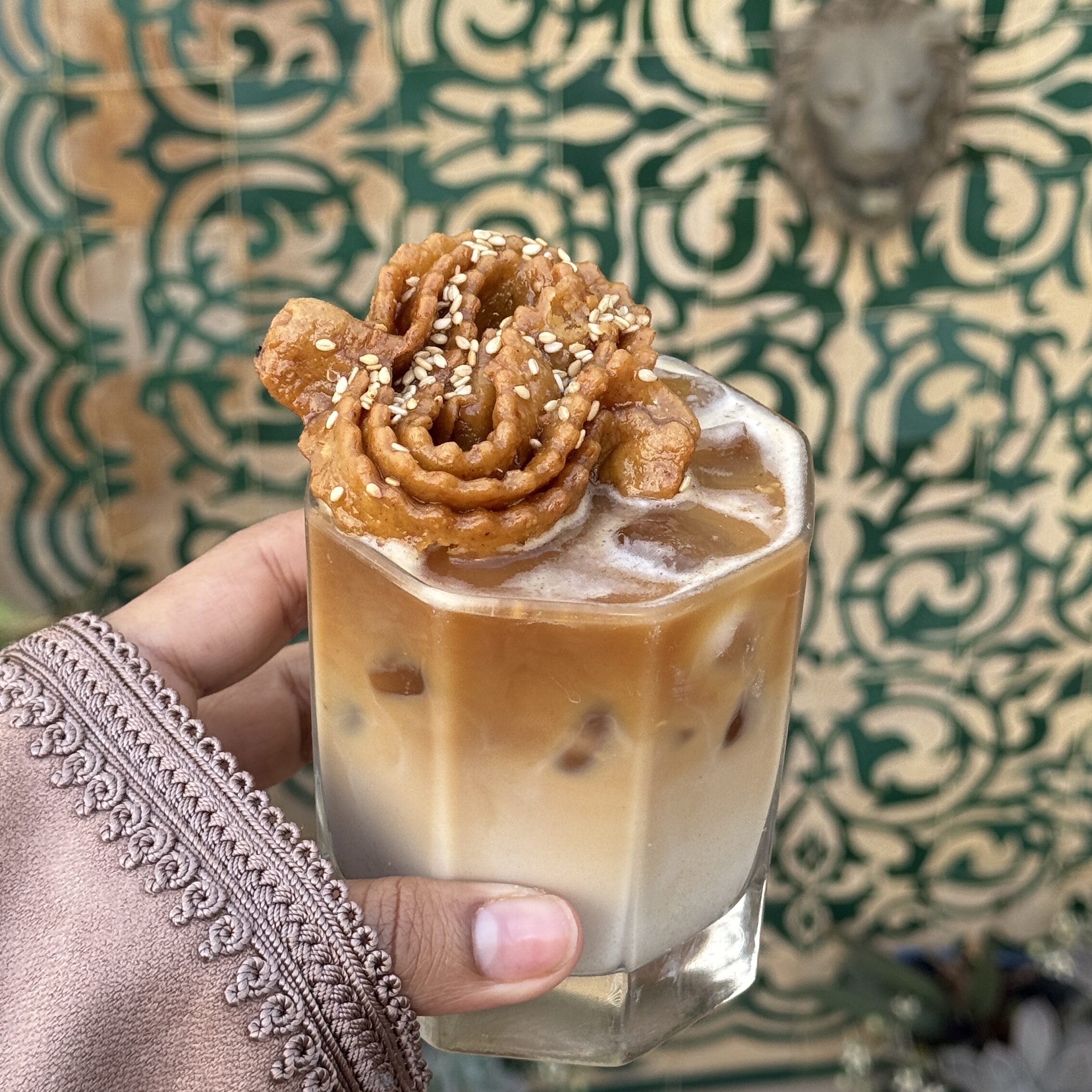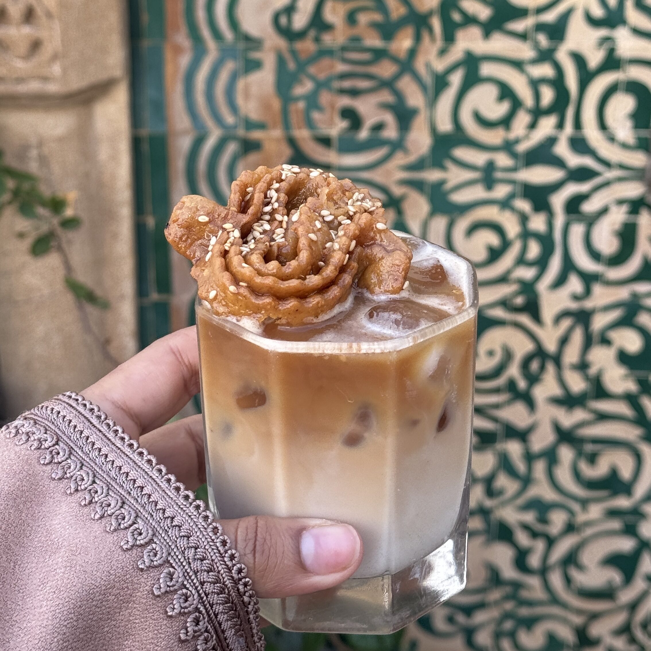 Chebakia Iced Latte is a coffee drink inspired by the flavors of the popular Moroccan Chebakia. The taste combines honey, sesame seeds, and warm spices like cinnamon; it’s a special treat this month during Ramadan or special occasions. Just pull a shot of espresso, add milk, and pour in a syrup made from honey, orange blossom water, and spices. Best to serve with ice and topped with honey or sesame seeds, any of your choice. This recipe is a fun and fusion recipe that makes Moroccans enjoy this sweet treat.