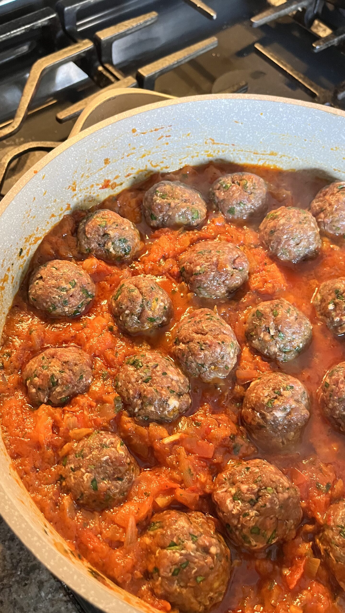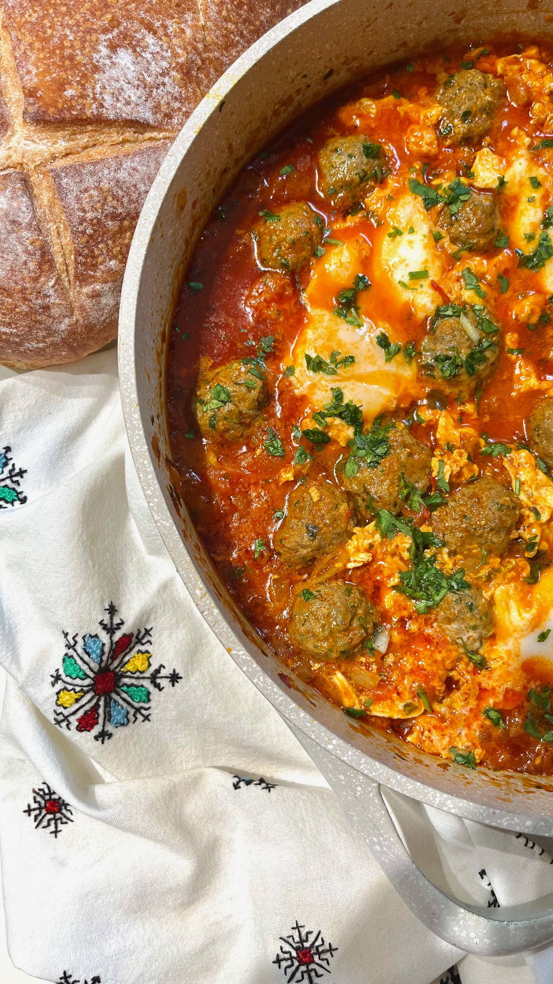 Kefta Tagine with Eggs is a beautiful fusion of two staples of Moroccan cuisine: kefta (seasoned ground meat) and eggs, all simmered together in a tagine—a traditional clay pot. The kefta, typically made from lamb or beef, is flavored with an aromatic mix of spices, fresh herbs, and onions. It’s then slowly cooked in a rich tomato sauce until it reaches perfect tenderness, and eggs are cracked on top, creating a delicious, creamy contrast to the savory meat. It's a dish that embodies the essence of Moroccan cooking: bold flavors, fresh ingredients, and a wonderful blend of textures.